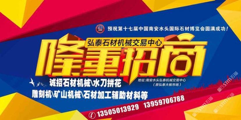 弘泰石材機(jī)械交易中心招租啦!現(xiàn)誠(chéng)招石材機(jī)械、水刀拼花、雕刻機(jī)、礦山機(jī)械、石材加工輔助材料等。本市場(chǎng)配備門面,倉(cāng)儲(chǔ),業(yè)務(wù)室可供商戶選擇,未來(lái)將打造成水頭專業(yè)的石材機(jī)械采購(gòu)一站式配套服務(wù),市場(chǎng)地段優(yōu)越,位于閩南建材市場(chǎng)正對(duì)面,邊上已聚集了來(lái)自全國(guó)各地一百多戶石材機(jī)械供戶商,可說(shuō)是天時(shí)地利人和,選擇比努力更重要。
