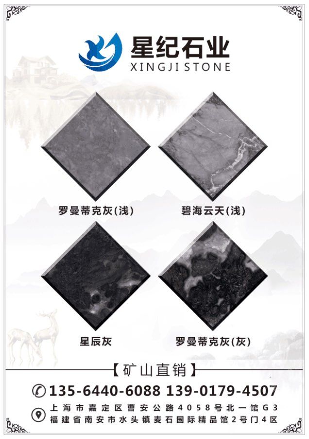 星紀(jì)石業(yè)專業(yè):龍馬礦星耀灰礦山直銷,底色一致,紋理清晰,適合各種工裝及家裝,常年備貨荒料5000噸,大板10萬方量大價(jià)優(yōu)。