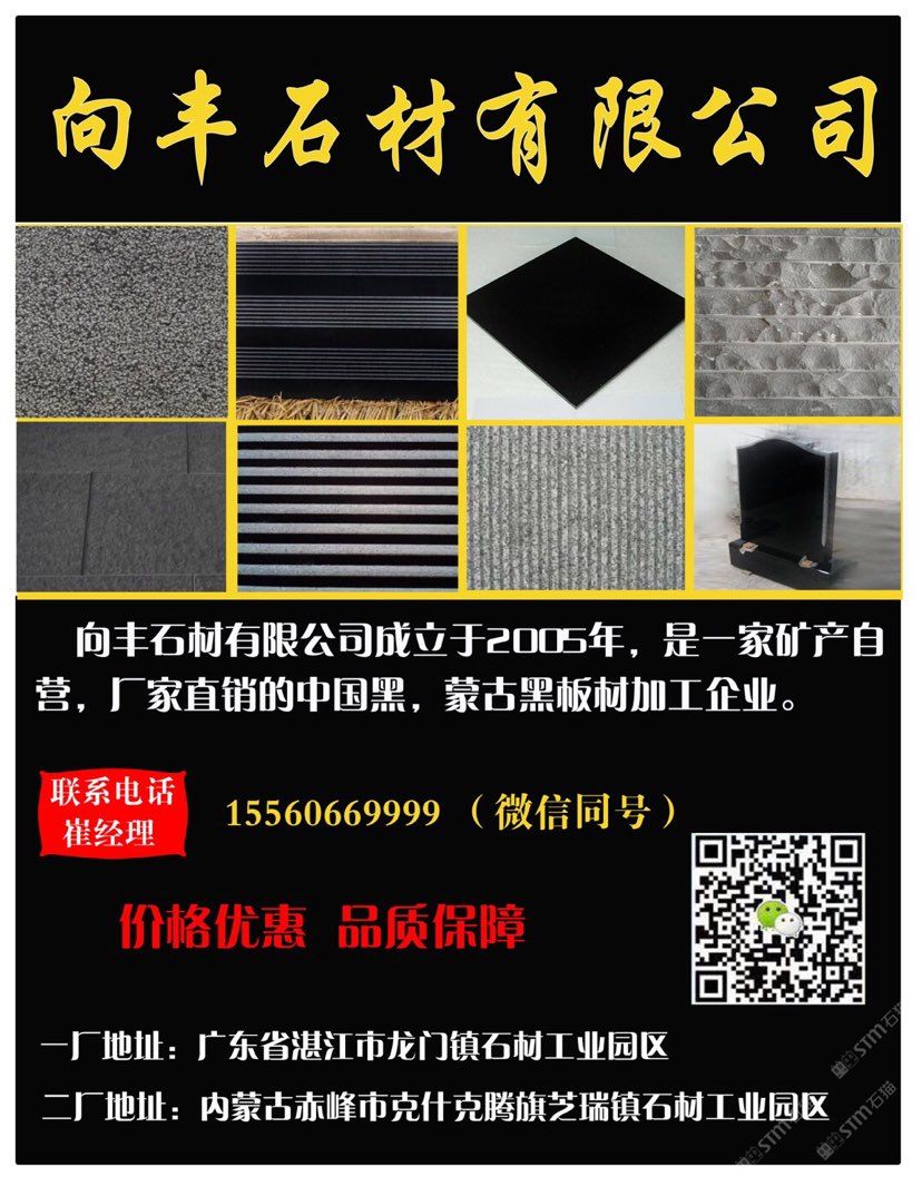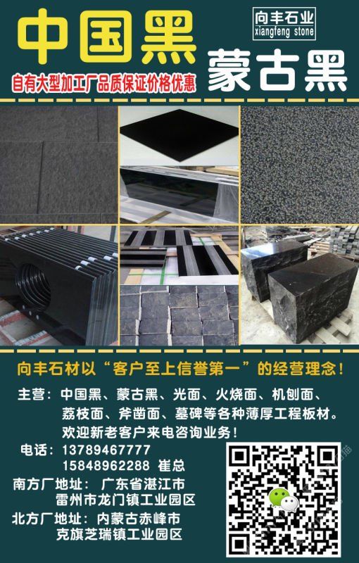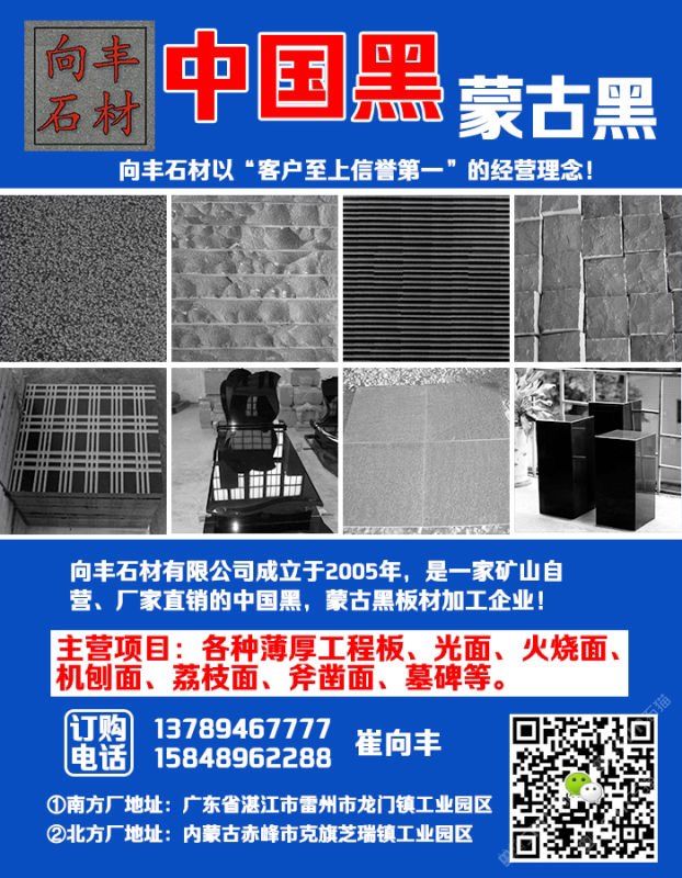 向豐石材有限公司成立于2005年,是一家礦山自營的蒙古黑板材加工企業(yè)!主營項(xiàng)目:各種薄厚工程板、光面、火燒面、機(jī)刨面、荔枝面、斧鑿面、墓碑等。向豐石材以“客戶至上信譽(yù)”的經(jīng)營理念,先進(jìn)的技術(shù)和現(xiàn)代化管理為基石,不斷的開拓創(chuàng)新與時(shí)俱進(jìn)?,F(xiàn)已經(jīng)發(fā)展為南北方跨區(qū)域生產(chǎn)企業(yè),至今完成多個(gè)大型項(xiàng)目并多次中標(biāo)。高效的生產(chǎn),優(yōu)質(zhì)的產(chǎn)品得到業(yè)主單位的好評(píng),樹立了良好的企業(yè)形象。我們堅(jiān)信,以“質(zhì)量求生存,誠信為根本”一定會(huì)贏得更好的明天!