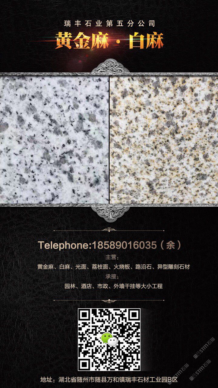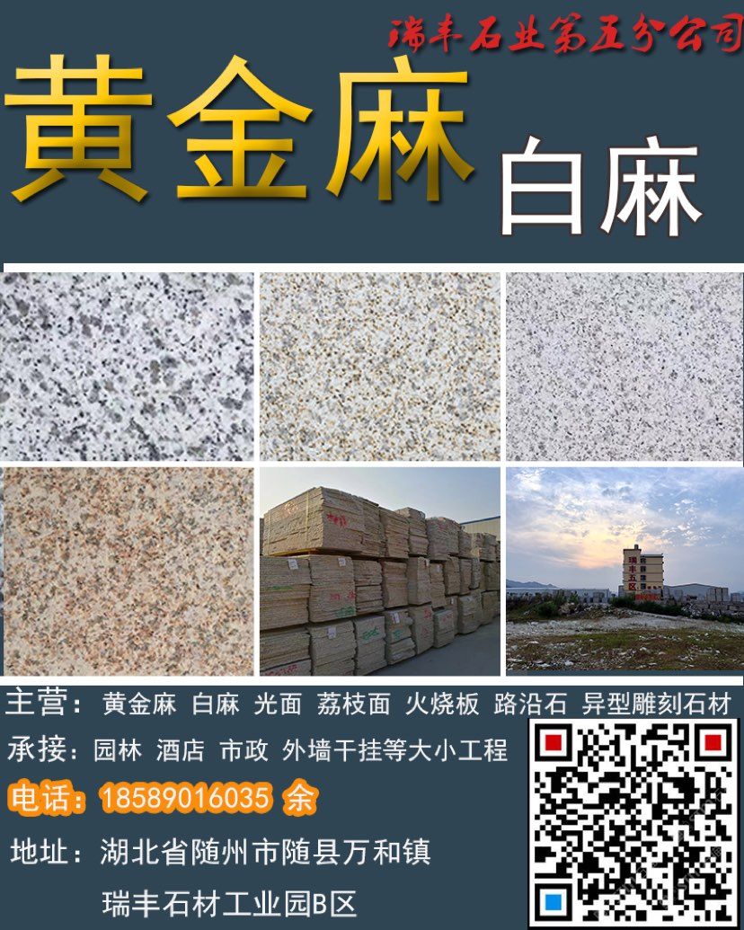 礦廠直銷;黃金麻,白麻,路沿石,蘑菇石,火燒面,光面,荔枝面,機切面,自然面,異形加工等各種規(guī)格板材。承接園林,廣場外墻干掛等各種工程應(yīng)用板材。規(guī)格齊全,保質(zhì)保量,歡迎新老客戶來電下單。18589016035