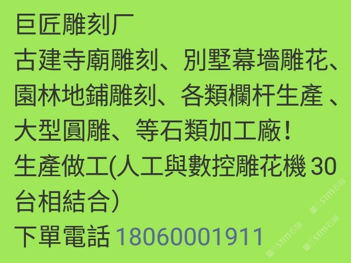 5年專(zhuān)業(yè)石業(yè)雕刻加工,寺廟古建、幕墻建材、園林欄桿,等石材雕刻類(lèi)加工。歡迎洽談合作!有意直接電話(huà)!微聊長(zhǎng)時(shí)間沒(méi)登