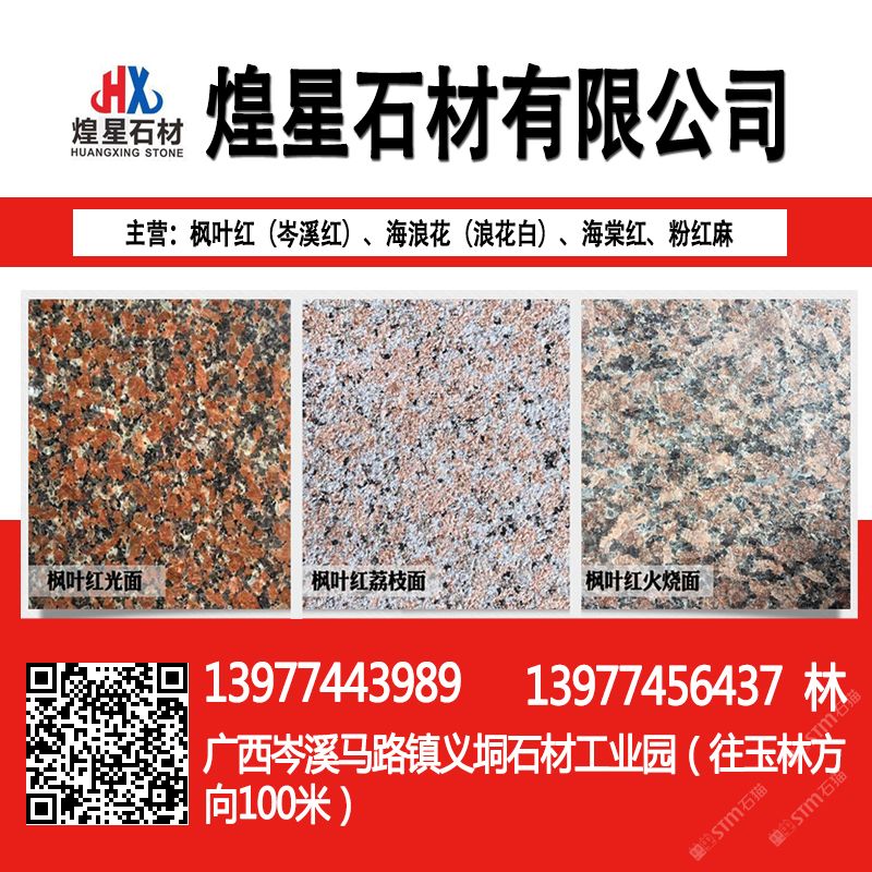 岑溪市煌星石材位于岑溪市馬路鎮(zhèn)義垌石材工業(yè)園,主要生產(chǎn)銷售:岑溪紅(楓葉紅),海浪花,海棠紅,三堡紅,粉紅麻,鐘山青,光板,毛板,火燒板,荔枝面,路沿石,異形板,大板以及各種工程板。\\\\\\\\\\\\\\\