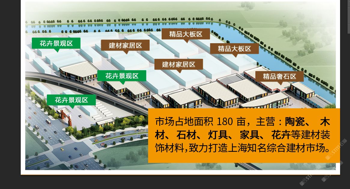 曹安路20年成熟市場(chǎng),公司自有房產(chǎn)證,地處國際汽車城安亭鎮(zhèn),11號(hào)線國際汽車城站200米,附近住宅密集。自2000年開業(yè)以來,已吸引各地300多家廠商入駐,市場(chǎng)運(yùn)營數(shù)十年,區(qū)域功能日臻完善,形成以陶瓷、衛(wèi)浴、木材、石材、家居等聚集區(qū),打造一站式建材家居市場(chǎng),全方位建材體驗(yàn)中心。 現(xiàn)增設(shè)石材精品館,石材采購基地。