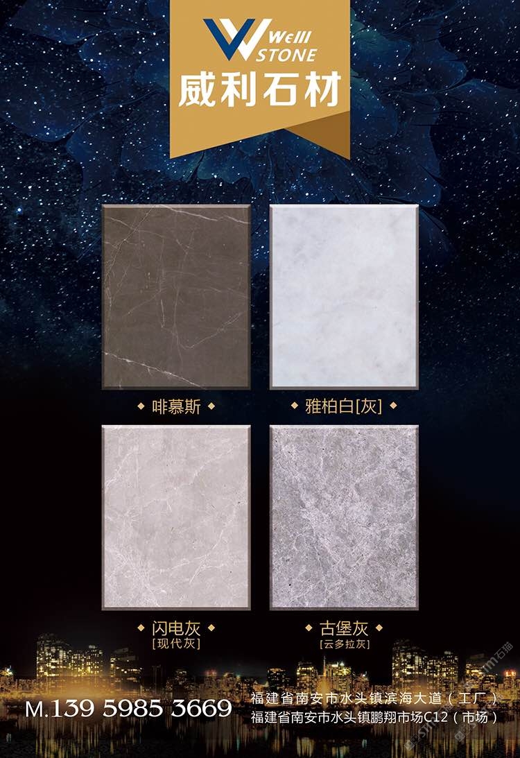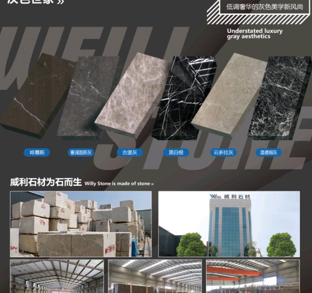 南安市威利石材有限公司成立于2008年,是一家集礦山開(kāi)采、加工、銷(xiāo)售、工程設(shè)計(jì)施工、進(jìn)出口貿(mào)易為一體的綜合型企業(yè)。我們不僅提供石材,更為您精心設(shè)計(jì)全套優(yōu)質(zhì)的石材解決方案。 威利石材專(zhuān)注于石材產(chǎn)品的礦山荒料直銷(xiāo)、大板加工、大板展銷(xiāo)、工程設(shè)計(jì)、工程配套施工服務(wù) 。公司主營(yíng)啡慕斯、黑白根、塞浦路斯灰、古堡灰,愛(ài)馬仕灰(溫德姆灰),雅柏白,閃電灰多種優(yōu) 質(zhì)品種。公司已成為一家集專(zhuān)業(yè)化、產(chǎn)業(yè)化和規(guī)?;墓こ滩牧喜少?gòu)、加工配套服務(wù)商。 威利石材以自己多年專(zhuān)業(yè)化和國(guó)際化的經(jīng)營(yíng),與國(guó)內(nèi)外礦山建立了良好的商業(yè)信譽(yù)和經(jīng)貿(mào)合作關(guān) 系,贏得了國(guó)外礦山在中國(guó)區(qū)營(yíng)銷(xiāo)戰(zhàn)略的全力支持。 威利石材依靠豐富的礦山資源,先進(jìn)的管理、施工經(jīng)驗(yàn),堅(jiān)持“以市場(chǎng)為導(dǎo)向、以技術(shù)為主體、 以質(zhì)量為命脈、以效益為中心”,大膽探索,在技術(shù)進(jìn)步、生產(chǎn)經(jīng)營(yíng)、企業(yè)管理、產(chǎn)品質(zhì)量、售后服務(wù)等 方面始終走在行業(yè)的前列。并在信守“質(zhì)量為準(zhǔn)、信譽(yù)優(yōu)等、服務(wù)為上”的企業(yè)精神指導(dǎo)下,產(chǎn)品暢銷(xiāo)世 界各地,深得消費(fèi)者的信賴(lài)和贊譽(yù)。我們時(shí)刻把握時(shí)代脈搏,走在市場(chǎng)前沿,揮灑石材文化,增添人類(lèi)輝煌。多年來(lái)我們一直致力于服務(wù)質(zhì)量的提高?!邦櫩蜑樯稀?、“追求圓滿(mǎn)”已經(jīng)融入到公司的企業(yè)文化、經(jīng)營(yíng) 理念當(dāng)中,并且在產(chǎn)品生產(chǎn)、過(guò)程服務(wù)、售后追蹤等具體工作中得到落實(shí)。 我們的追求——集世界美石,為中國(guó)添彩!\