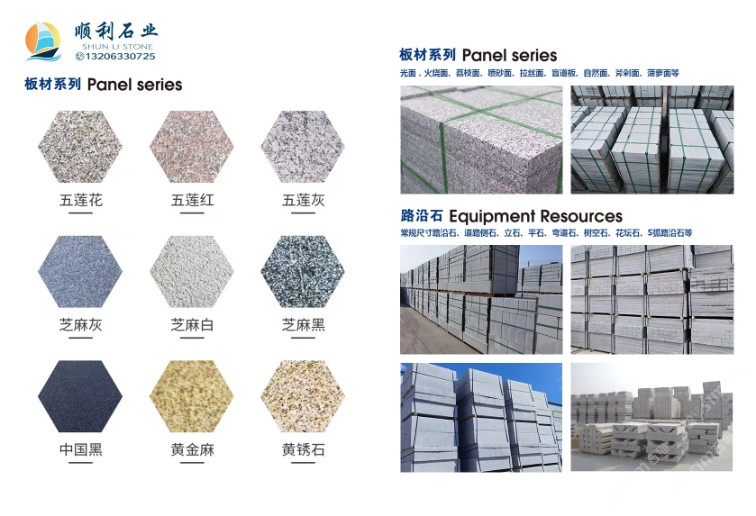 產(chǎn)品有五蓮紅、五蓮花、五蓮灰、芝麻灰、黃金麻、芝麻白、芝麻灰、山東白麻、櫻花紅、珍珠花等多種花崗巖板材,臺(tái)階石、路沿石、 S 型路沿石,異型路沿石,弧形彎道石,蘑菇石、火燒板、機(jī)刨板、等各種異形石材。多年來(lái),產(chǎn)品銷往全國(guó)各地。五蓮花崗巖板材被評(píng)為省優(yōu)、部?jī)?yōu)產(chǎn)品。并得到了廣大用戶的認(rèn)可及社會(huì)各界的好評(píng)。