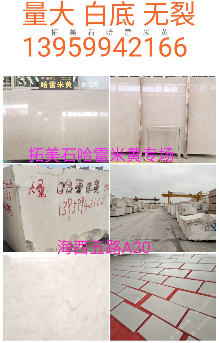 發(fā)布信息: 拓美石??<哈雷米黃專場(chǎng)> ??新沉香石灰石萊姆石 新老礦不同價(jià)位。礦山直銷,每月到正礦A級(jí)荒料,常年備貨2000噸↑,無裂,花色均勻,可訂切不同厚度。請(qǐng)放心接單 ??海西市場(chǎng) ①門進(jìn) 海西五路A20 拓美石13959942166龐