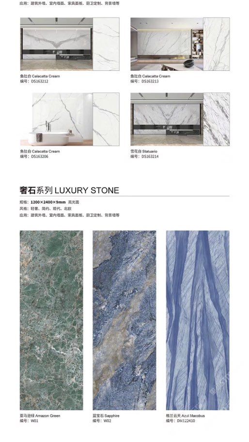 發(fā)布信息: ????SIBELAN 斯貝納巖板???? ????意大利設計師精選巖板???? 我們可以幫老總您加工為成品, 全國范圍內可安排專業(yè)團隊安裝. 做到您一次性采購 省心. 放心. 省時. 低價! 巖板紋路版面全多達199 款 勵志做服務五星的巖板專業(yè)供應商 魚肚白 雪花白 格蘭云天 寒江雪 爵士白 幻影灰 勞倫黑金 火山灰 亞馬遜 艾維拉 羅馬黑檀 貝特巖 細花白 羅馬灰 云朵拉灰 魚肚金 莎羅娜 莎羅蘭 勞倫白金 拉薩白 中花白 灰冰玉 卡拉拉白 撒金黑 清水玉 薩瓦灰 莎士比亞 大花灰 白冰玉 銀灰洞 阿瑪尼灰 綠紋玉 綠冰玉 藍紋玉 保加利亞灰 鐵銹 黑木紋 流砂灰 純白 純灰 純黑 TEL: 15905069590 聶 各種版面規(guī)格全部如下: 1200×600×11mm 啞光 1500×800×11mm 啞光 1800×900×11mm 啞光 1800×900×12mm 啞光 2600×800×15mm 啞光 2400×1200×6mm 啞光/亮光 2400×1200×9mm 啞光/亮光 2400×1200×15mm 啞光 2700×1200×6mm 啞光/亮光 2700×1600×12mm 啞光/亮光 3200×1600×6mm 啞光/亮光 3200×1600×12mm 啞光/亮光