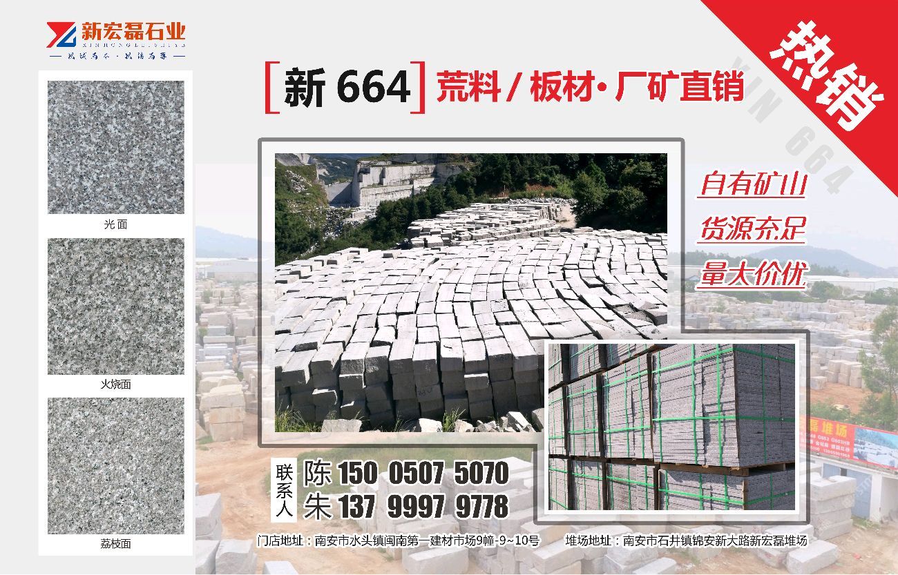 發(fā)布信息: 新664 荒料礦山直銷(xiāo) ,量大價(jià)優(yōu)!15005075070陳 13799929778 朱 門(mén)店地址:南安市水頭鎮(zhèn)閩南建材市場(chǎng)9幢-9~10號(hào) 堆場(chǎng)地址:南安市石井鎮(zhèn)錦安新大路新宏磊堆場(chǎng)