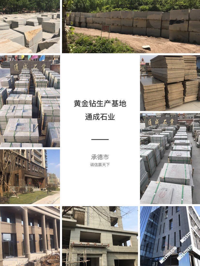 發(fā)布信息: 我公司以礦山開采石材加工為一體主要經營:黃金鉆、電解黃金鉆、寶金石、皇室珍珠、沙漠金棕、承德綠、沙漠綠洲、藍豹、皇室啡、燕山綠、荔枝面、火燒板、光板、機切面、蘑菇石、盲道石 異型加工等二十多種石材產品。承接園林、廣場、外墻干掛等各種工程應用板材。我公司奉行:以質量求生存、以信譽求發(fā)展的原則,誠石守信、主客雙贏、同等的質量比價格、同等的價格比質量的經營理念。誠迎各界商客朋友來我公司參觀指導洽談業(yè)務!訂購熱線:? 13832461168 13653249345(微信同號)
