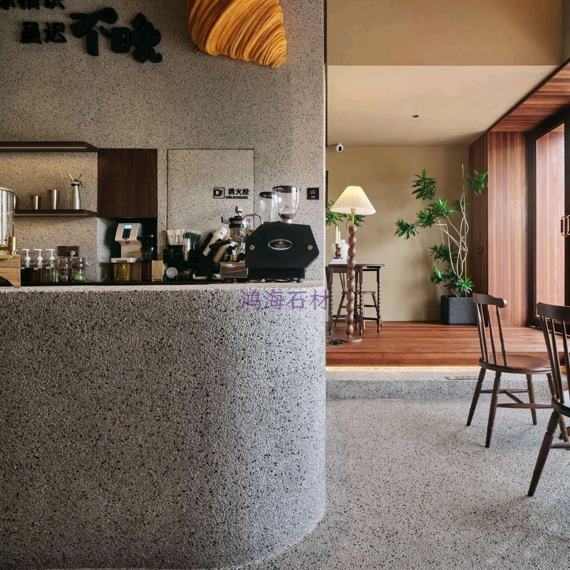 發(fā)布信息: 咖啡店設計干貨|水磨石 木格柵的組合 一進門就被水磨石打造的吧臺狠狠洗衣,顆粒感的肌理搭配溫潤的木質(zhì)吊柜,觸感和視覺的碰撞真的太妙了~ 墻面的“與你相識雖不晚”直接戳中內(nèi)心,旁邊的巨型可頌裝置既是裝飾又點明了品類,細節(jié)感拉滿。 動線設計也很舒服,點單區(qū)和取餐區(qū)劃分清晰,哪怕人多也不會覺得擁擠,把功能性和美學平衡得恰到好處。