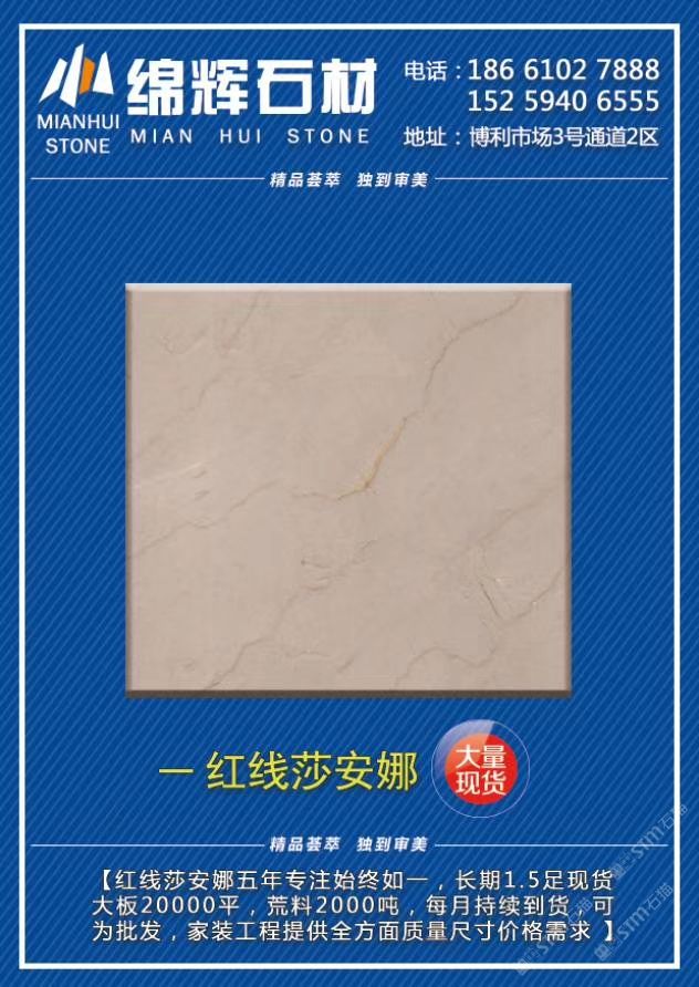 發(fā)布信息: 綿輝石材·博利3通道2區(qū)賣場 全場新貨《紅線莎安娜》1.5光板2萬平,荒料2千噸。走量不走價,總有一款適合您!可為您提供家裝/批發(fā)/工程單/全方面的價位尺寸質(zhì)量需求! 綿輝石材·石通天下E10區(qū)賣場 2800平《金歐典》5900平《紅線莎安娜》限量特價90元起,工程單福利,清完為止,速來撿漏 咨詢熱線:13004819222李