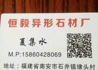 恒毅石材工業(yè)主營(yíng)產(chǎn)品:石島紅(老8號(hào)),688,657銹石,639,G606(正礦),泉州白,永定紅(光面),芝麻黑654(新礦)企業(yè)地址:福建南安石井鎮(zhèn)埭頭村